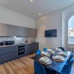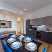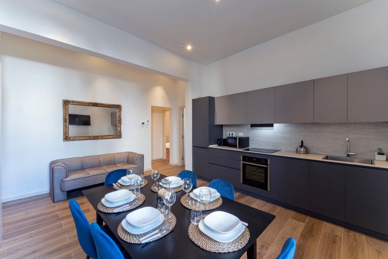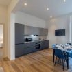 - Modern, fully equipped kitchen with induction cooktop, oven, microwave, refrigerator, and dishwasher.
