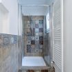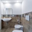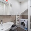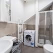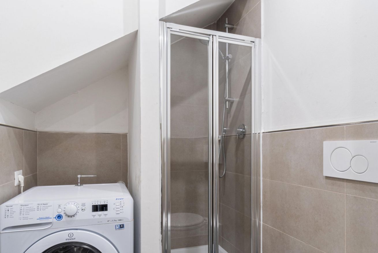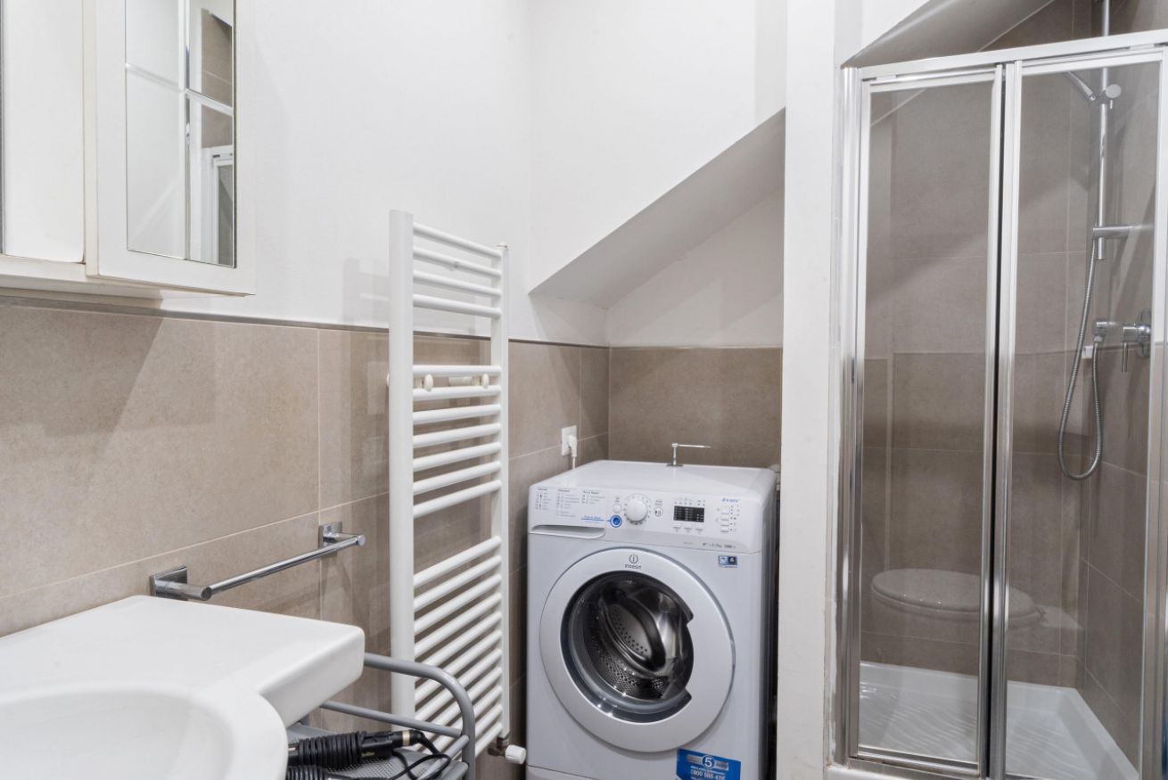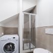 Two modern bathrooms with showers, one of which includes a washing machine.