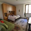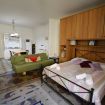 - Large open living/sleeping area furnished with a double bed, a single sofa bed, and a basic kitchenette equipped with 2 burners, sink, microwave, and fridge.