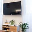 A cozy living room with a sofa and TV, brightened by two large windows that bring in natural light.